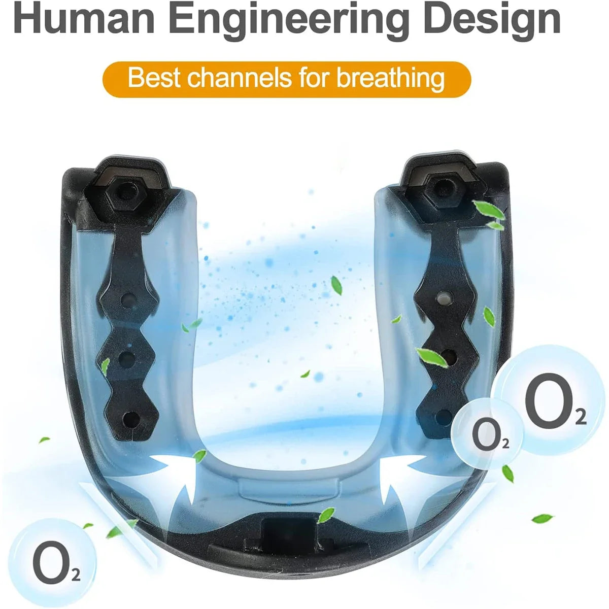 [Perfect Design with Strap] Our mouthguard has three strategically placed perforations to allow air to escape more freely and provide you with a more relaxed breathing experience. Each mouthguard comes with an interchangeable tether that allows the mouthguard to be used with or without a shoulder strap.