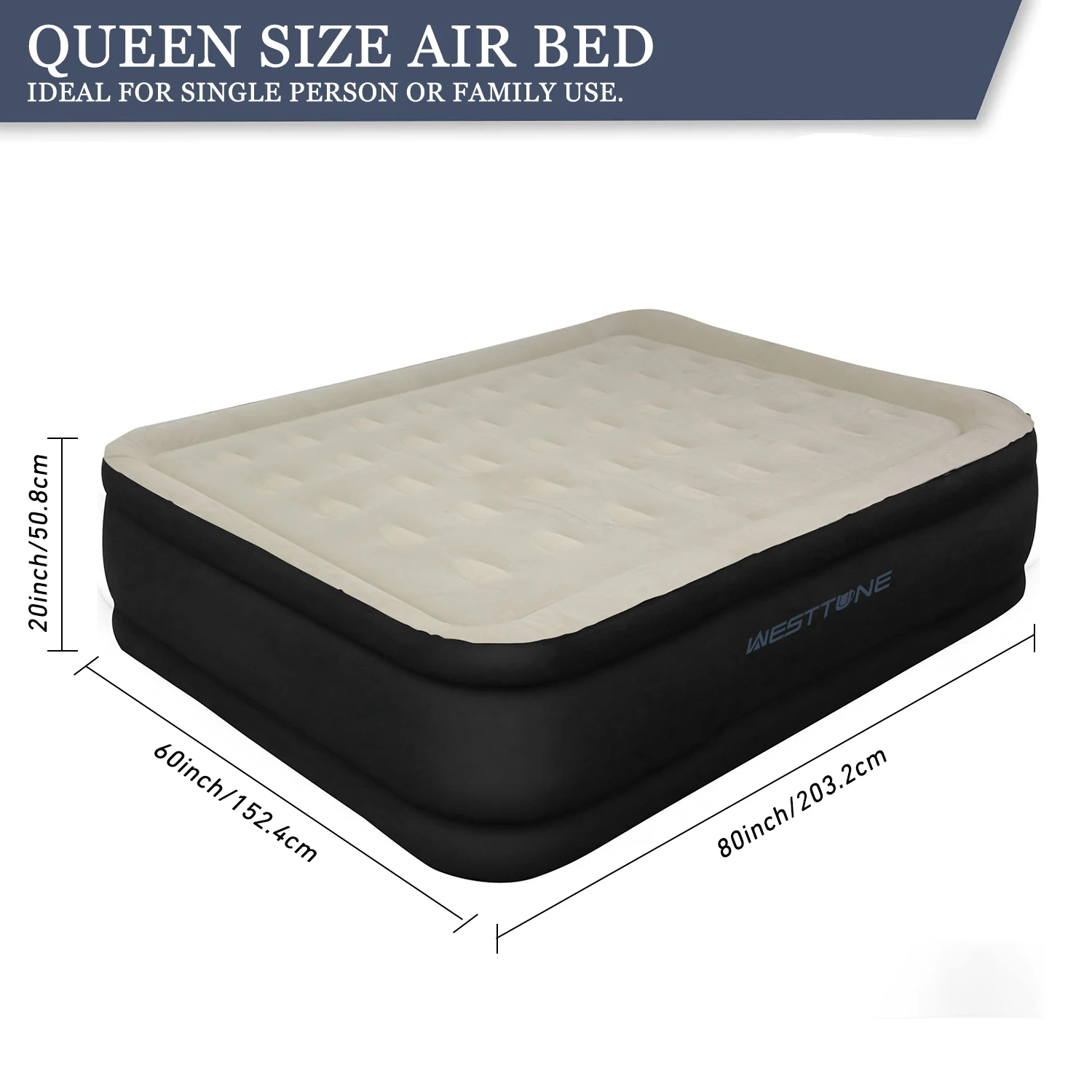 WESTTUNE LUXURY QUEEN AIR MATTRESS: Experience unparalleled comfort with our Queen-sized airbed, featuring a luxurious pillow top, soft flocking layer and enhanced coil-beam construction for maximum support. Built to last with durable, waterproof, and puncture-resistant materials, this air mattress is your go-to solution for a restful night's sleep.