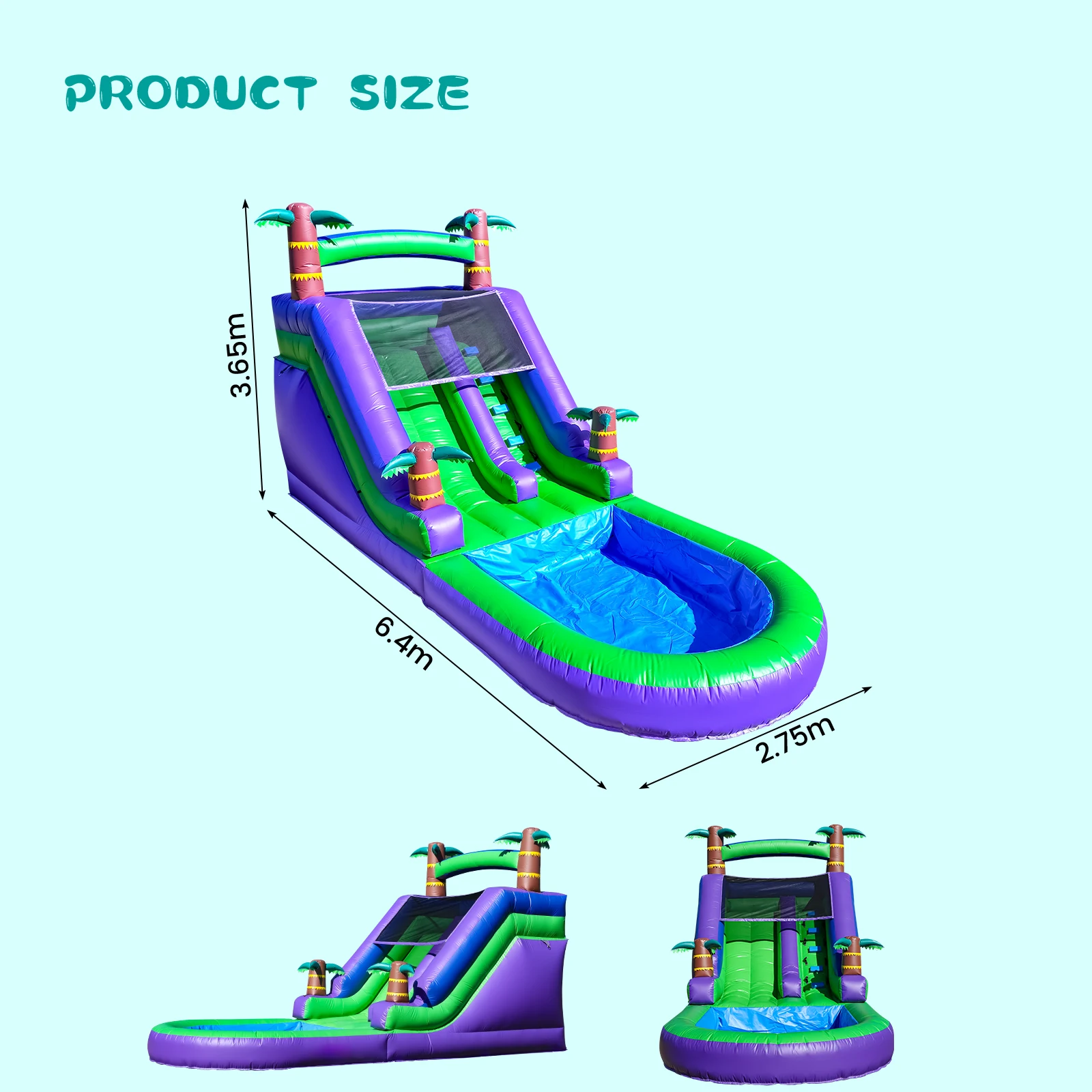 BACK TO the JUNGLE -- Slide and jump,who likes a monkey in our tropical oasis slides for kids! Owing your own commercial inflatable slide for parties, special events, or just because wanting your children have a wonderful playing and exercising paradise ! Measuring 21 feet in length x 9 feet wide x 12 feet high, it holds max 3 kids(90lb/person) at a time ( with a maximum weight limit of 500 pounds around).